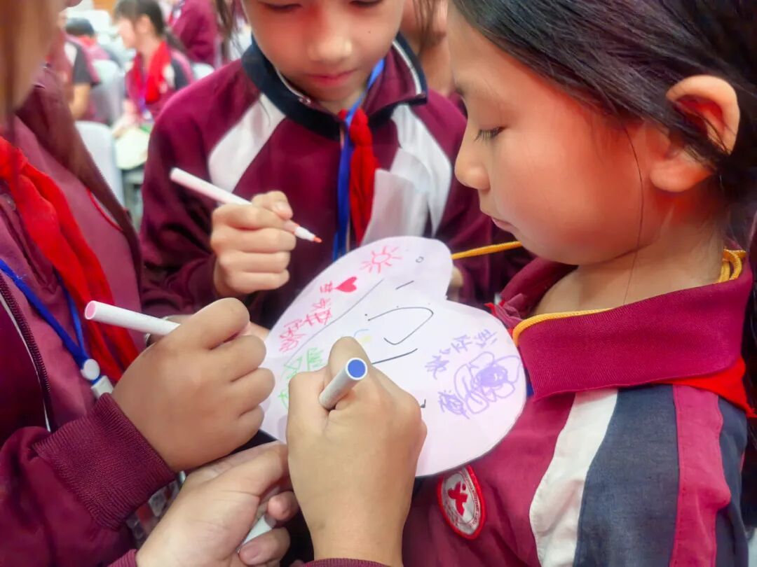任务A“伤痕与修复”,以视觉化方式帮助学生体会语言暴力的伤害与修复的力量。同学们依次用黑色笔在心形挂牌上画出“伤痕”,象征欺凌带来的心理创伤;随后又用彩色画笔共同绘制代表支持与温暖的图案,并说出“没关系”“我陪你”“你很棒”等积极语言。从黑到彩的视觉对比,让学生深刻感受到善意行为的治愈力。